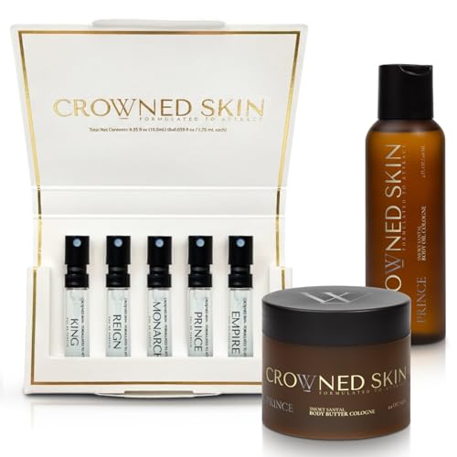 Upgrade your grooming routine with the Crowned Skin Prince Body Butter, Body Oil, and Men’s Cologne Discovery Bundle, a complete luxury men’s fragrance set designed for hydration, versatility, and long-lasting performance. The Prince men’s body oil cologne is formulated with natural, noncomedogenic ingredients like jojoba and grapeseed oils to deliver lightweight moisture as a scented body oil for men that enhances fragrance longevity. Paired with the ultra-nourishing men’s body butter cologne enriched with shea and mango butters, this bundle locks in hydration while surrounding you with a masculine fragrance that draws compliments. This premium bundle combines a men’s cologne discovery kit featuring five signature Eau de Parfums with a hydrating body oil for men and a rich cologne body butter for men to create a layered, confident scent experience. The men’s fragrance sampler set includes King, Monarch, Reign, Prince, and Empire in convenient travel-size vials, offering warm, spicy, fresh, smoky, and citrus-musk profiles crafted as eau de parfum for men and providing depth and projection. Each long-lasting cologne for men adapts to your body chemistry, making it ideal for daily wear, date night cologne moments, or special occasions. Whether you are searching for a cologne gift set for men, birthday gifts for him, or an anniversary gift for your husband, this niche fragrance discovery set offers a refined way to discover your signature scent for men while maintaining smooth, moisturized skin.