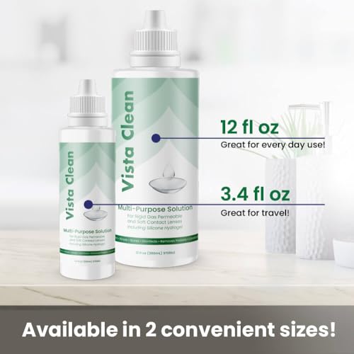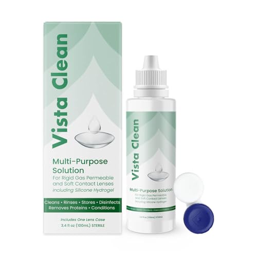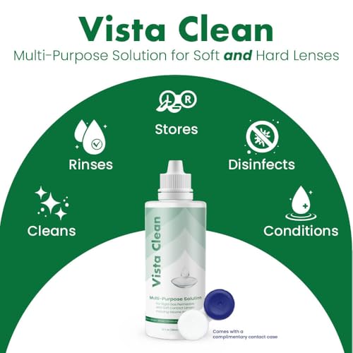 Maintain crystal clear vision with Vista Clean’s Multi-Purpose Solution, expertly formulated for both rigid gas permeable and soft contact lenses. This versatile solution cleans, rinses, and stores your lenses while removing blockage and conditioning them for optimal comfort. Included is a convenient lens case for easy storage. The 3.4 fl oz (100mL) sterile bottle ensures long-lasting freshness. Simplify your lens care routine with Vista Clean’s all-in-one solution, designed to keep your lenses in pristine condition.