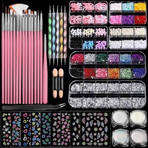 FANDAMEI Nail Art Brushes Set, Nail Art Kit, Nail Design Kit, Nail Dotting Tools, Nail Kit for Beginners, Chrome Nail Powder, Nail Stickers, Nail Rhinestones, Nail Charms Gems Nail Art Decoration Kit