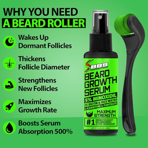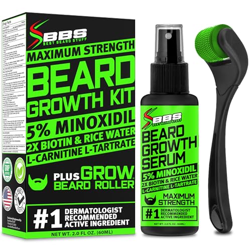 Best Beard Stuff Growth Kit with 5% Minoxidil Serum (Minoxidil 5 Percent + 2X BIOTIN + Rice Water) & Beard Roller for Men