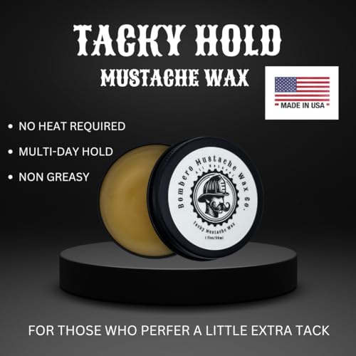 Bombero Mustache Wax Co. Tacky Wax is an all-natural, non-greasy, medium-application wax with extra tacky, superior hold. Ideal for taming flyaways and keeping your mustache groomed for days. Tested in fire service and construction, it withstands harsh environments, hard work, and greasy foods. Comfortable all-day wear, easy to remove with oil, and perfect for achieving a polished look.