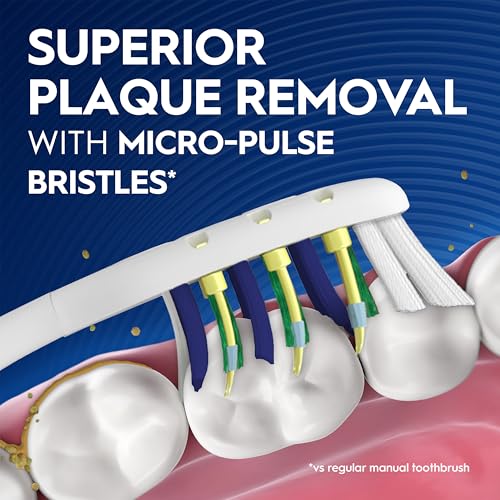The Oral-B Plaque Remover Pulsar toothbrush is battery operated and provides superior plaque removal with micro-pulse bristle vibrations versus a regular manual toothbrush. The vibrating bristles on this toothbrush help break up plaque between teeth. The split head design moderates the amount of pressure applied to your teeth and gums. Power tip bristles on the toothbrush head reach deeper and provide a precision clean behind teeth. Oral-B is the #1 Toothbrush Brand Used by Dentists Worldwide. Oral-B toothbrush color may vary. A new toothbrush cleans 95% better in hard-to-reach areas*, remember to change your toothbrush every 3 months. *vs one 3 months old; research with a flat trim toothbrush
