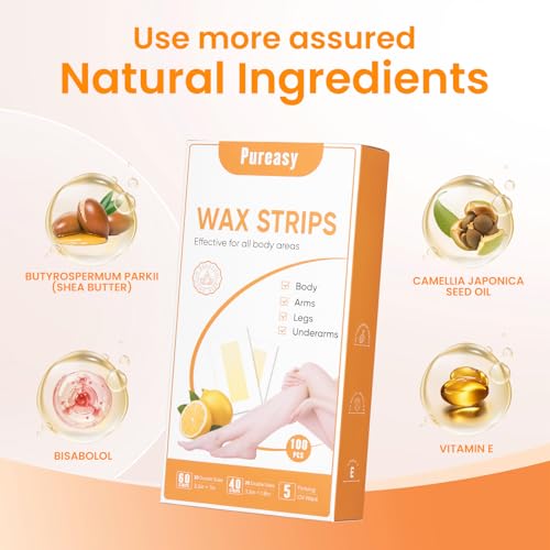 100 PCS Wax Strips for Hair Removal: 40 Facial & 60 Body Hair Removal Waxing Kit with Calming Oil Wipes – For Face, Eyebrow, Body, Arms, Legs, Bikini Area