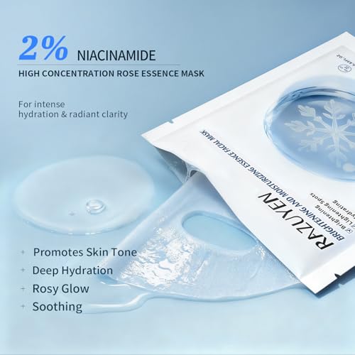 Brightening Hydrating Face Mask (10 PCS), Glowing & Moisturizing Sheet Mask with Niacinamide, Rosa Water and Arbutin, Rose Face Mask For All skin types, Added Fragrance Free