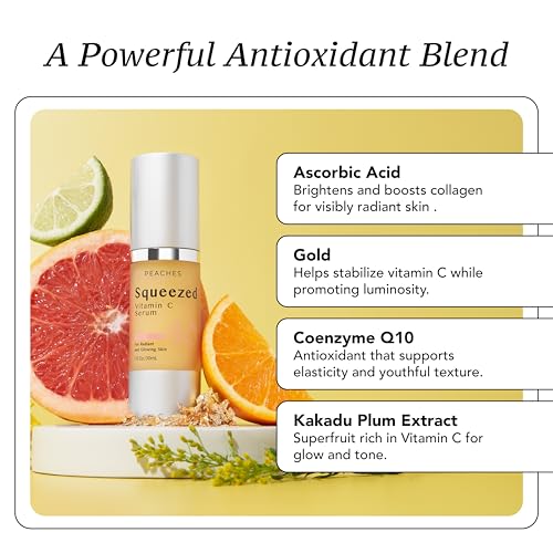 Peaches Skin Care Squeezed Vitamin C Serum with Kakadu Plum, Gold and CoQ10 – Lightweight Hydrating Formula for Radiant-Looking Complexion – Vegan Skincare for Women, 1 fl oz
