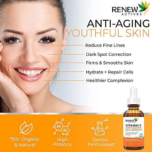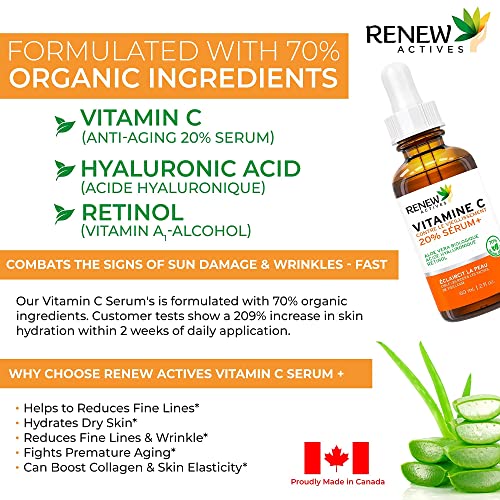 RENEW ACTIVES Vitamin C Serum – Brightening & Anti-Aging Formula – Reduces Dark Spots, Fine Lines & Wrinkles – Promotes Even Skin Tone – Hydrating & Antioxidant Protection – Made in Canada – 2 fl oz